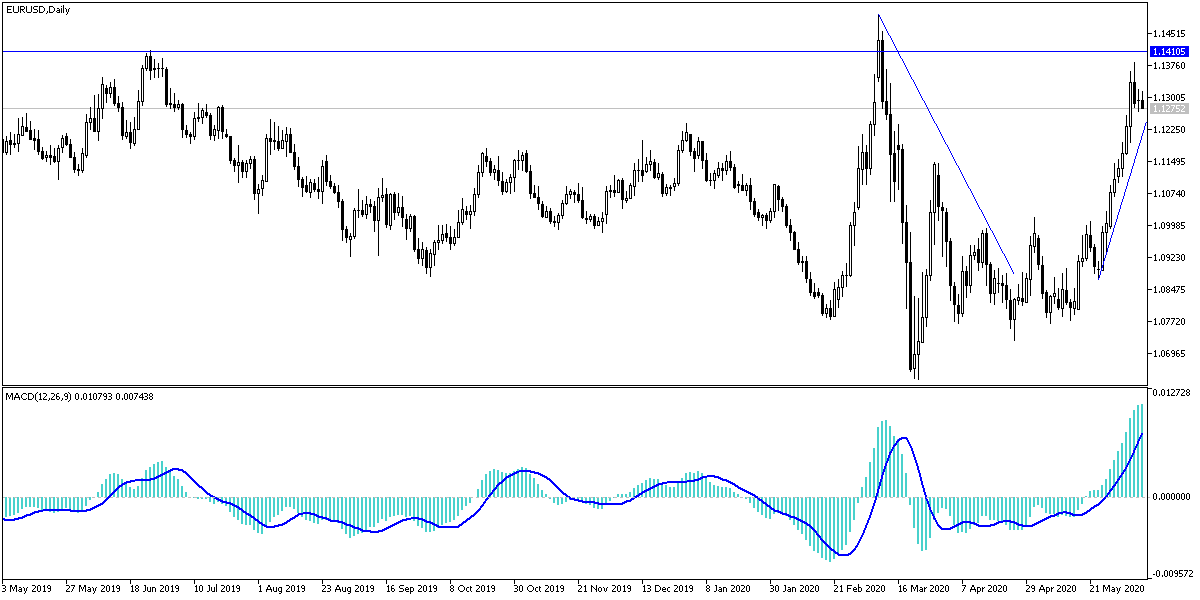In the beginning of this week’s trading, the EUR/USD pair tried to compensate for its losses, which came as a result of the better-than-expected US jobs numbers, as the pair moved towards the 1.1278 support after stronger gains that pushed it towards the 1.1383 resistance, and an attempt to bounce back yesterday pushed it towards the 1.1320 resistance before settling around the 1.1300 level in early trading on Tuesday, and ahead of the announcement of the GDP growth rate in the Eurozone. On the economic side yesterday, official data showed that German industrial production fell by approximately -18% in April compared to the previous month, at the height of the economic closure policies to counter the outbreak of the Corona epidemic.