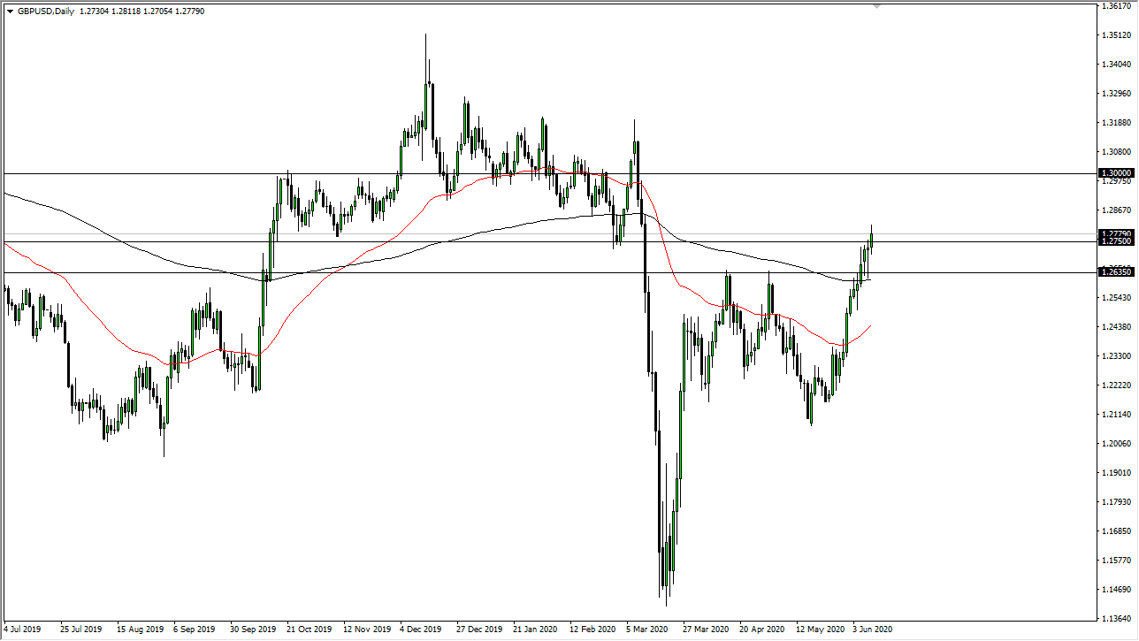 The British pound has pierced a major resistance during the trading session on Wednesday but has given back quite a bit of the gains in a sign of uncertainty. At this point, breaking above the 1.2750 level is a sign that we are going to go higher in theory, but at this point in time it is obvious that we are going to go straight up in the air. After all, this is a market that that has been very bullish, and of course the US dollar has been pummeled. However, there seems to be a bit of hesitation at this point so I think we may get a little bit of “back infiltrating”, meaning that there will be short-term dips that traders continue to get involved in. With that, I think that the market eventually wants to go higher, and of course after the Federal Reserve suggesting that they were going to continue with quantitative easing, that should work against the value of the US dollar.