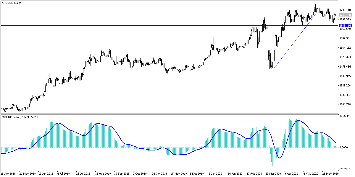 For three trading sessions in a row, the gold price is back to correct upwards and compensate for its recent losses, which extended to the $1671 support at the end of trading last week. Gains of the current bounce pushed the price of the yellow metal towards the $1720 level dolla, amid cautious anticipation until the announcement of the US inflation figures and what the US Federal Reserve will announce today. Gold prices have risen to coincide with the decline in global stock markets after the World Bank warned of the sharp contraction of the global economy, and today the Fed is widely expected to be very pessimistic despite the surprisingly strong employment report for May. It will be a difficult budget task for the bank to remain supportive as companies reopen after being closed for months.