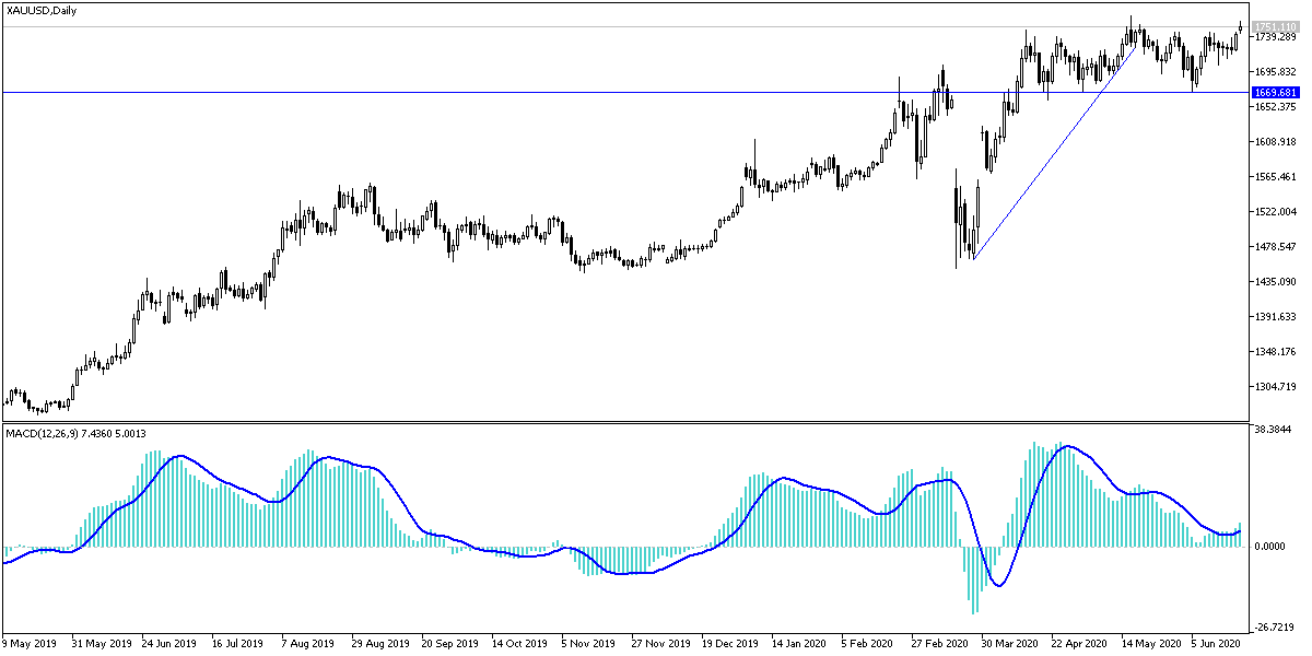 After several attempts in which gold prices tried to bounce upward, it succeeded during last Friday's trading session to move higher to the $1745 resistance an ounce, the highest level in a month, amid renewed fears of financial markets and investors from the start of a second wave of the COVID-19 pandemic, as the global economy did not celebrate the reopening. We expected before that the bullish momentum will continue, if the global cases and deaths increased due to the reopening of the economies without reaching a vaccine that eliminates the disease. The yellow metal started this week’s trading upward to the $1758 resistance.
