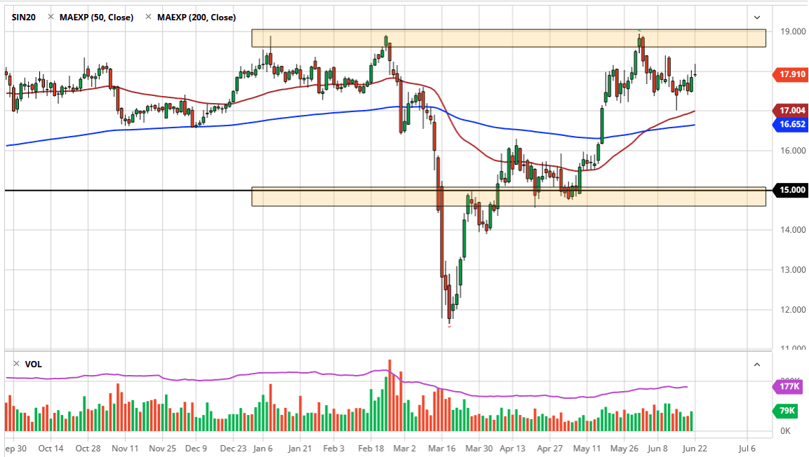 However, if we break above the candlestick for Monday’s session, that would be a very bullish sign and at that point, I think we would more than likely go looking towards the $19 level given enough time. I think silver gets a bit of a boost regardless, mainly due to the fact that central banks around the world continue to crush their currencies as they continue to see quantitative easing as the way out of the economic situation that the market has found itself in after the coronavirus outbreak. Considering that the central bank participants all were looking to do quantitative easing before the pandemic, it will essentially be on steroids at this point, and that is very bullish for precious metals in general, although I am the first to admit that gold will probably outperform silver in that environment.