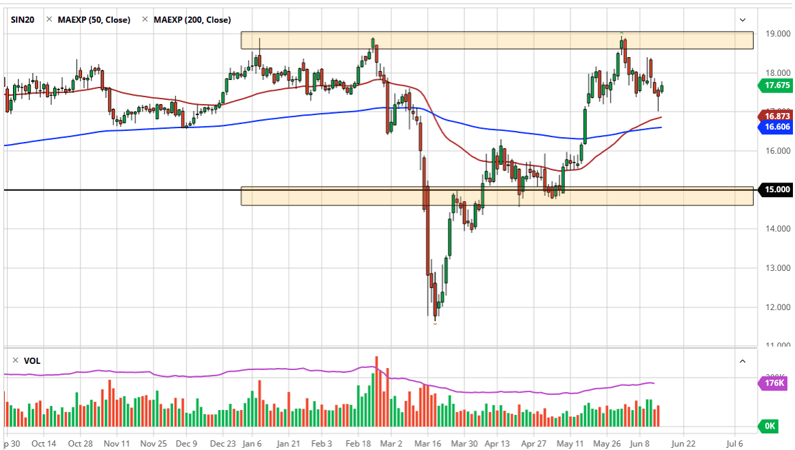 A breakdown below the 50 day EMA probably opens up a move down to the 200 day EMA which is currently trading at the $16.60 level, as well as the $16 level under there. Between $16 and $15 under there, we should see plenty of support based upon the fact that we had so much consolidation in that area. Ultimately, I have no scenario in which I’m willing to sell silver but I do recognize that the industrial demand part of the equation is something that people will be paying quite a bit of attention to as it certainly will be a bit of a drag on this market. If you are looking to play the precious metal straight, I still think that gold will continue to be the best way forward, although it should be noted that the silver market will be dragged right along in the same overall direction. I do not sell either metal right now, or do I think that eventually, they both will break out.