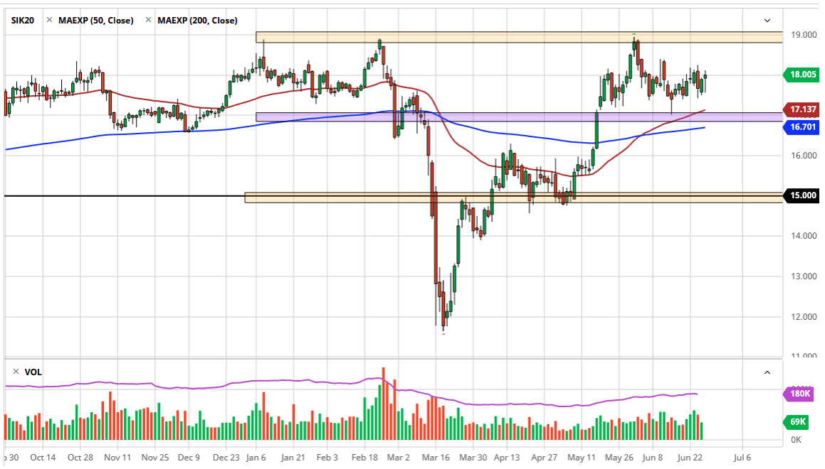 The 50 day EMA is currently sitting at the $17 level, an area that is a large, round, psychologically significant figure, and the midway point between the larger supporting resistance levels at the $15 level and the $19 level. When looked at through the prism of longer-term trading, the $17 level is crucial, and essentially “fair value” for the last several months. This market is likely to see a lot of noise due to the fact that silver moves not only based upon central bank actions when it comes to liquidity measures, but also industrial demand which can rotate quite drastically.