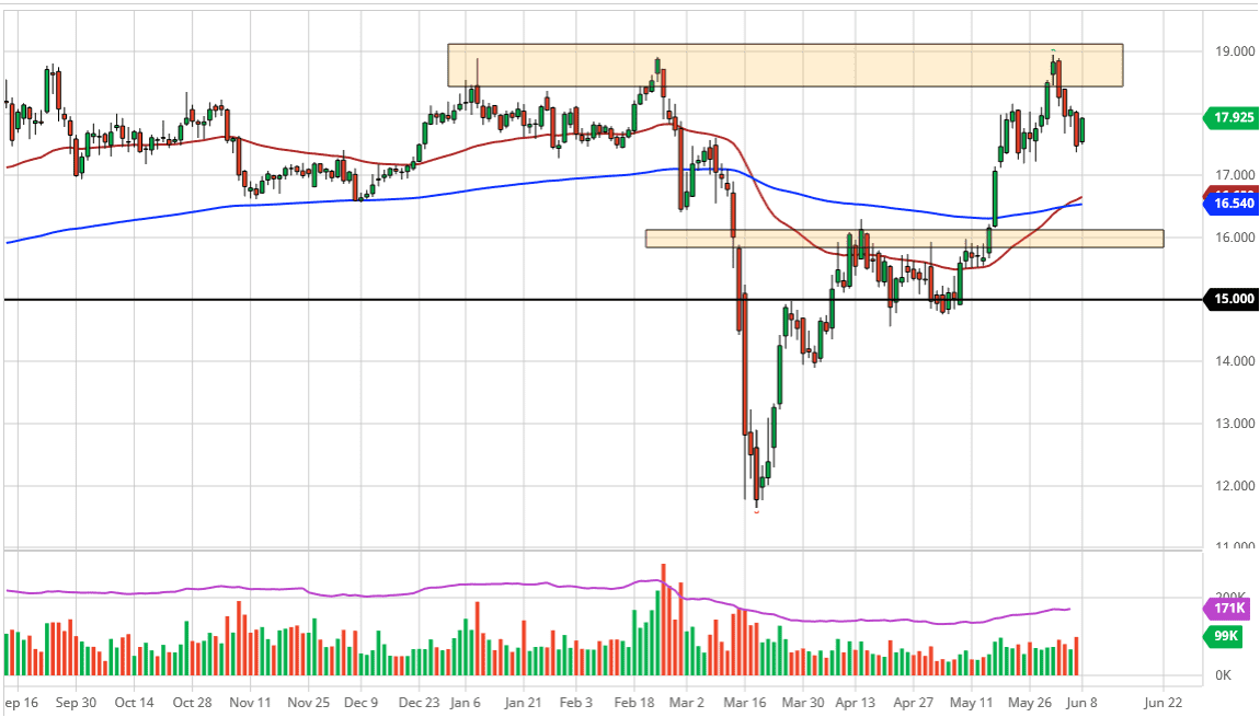 From a technical analysis perspective, this is still a very bullish market and I do think that we will make another run towards the $19 level. Albeit, it may be more of a grind than anything else. Looking at pullbacks continues to be the best way to pick up a bit of value, as the silver markets have gotten a bit stretched. Longer-term, it is only a matter of time before we break out to the upside but that could be weeks, if not months. With that, I am building up a larger position based upon small bits and pieces along the way. This not until we break down below the $15 level that I would be concerned from a longer-term trend perspective.