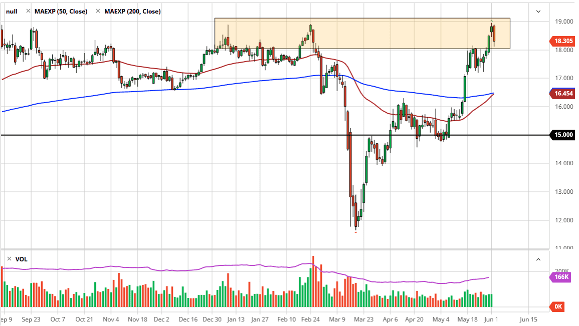 If we break down below the $18 level, then it is likely that we go to the $17.25 level. That is an area that has been supported lately, and if we break down below there then we could go looking towards the 50 day EMA. Ultimately, looking at the candlestick for the session on Tuesday tells me that we probably have a bit of a pullback coming. That is healthy for the longer-term move, sell I am bullish, but I also recognize that you need to get a decent price when you jump into the market.