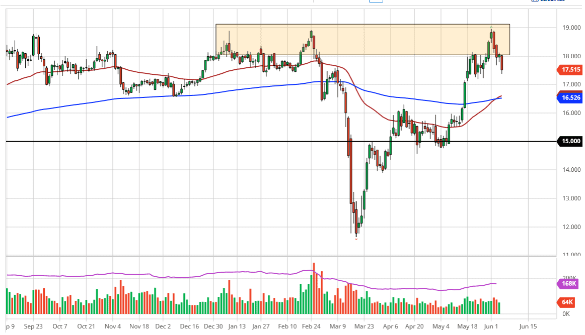 To the upside, the $19 level courses significant resistance, and therefore I think that if we were to break above there it would be a huge sign in the fact that we are going to go looking towards the $20 level. That is a large, round, psychologically significant figure, and if we can break above there it could start a massive explosion to the upside. Ultimately, if we can break above there then it will probably be a massive run on silver just waiting to happen. We have seen this before, but I do not think that happens quite yet.