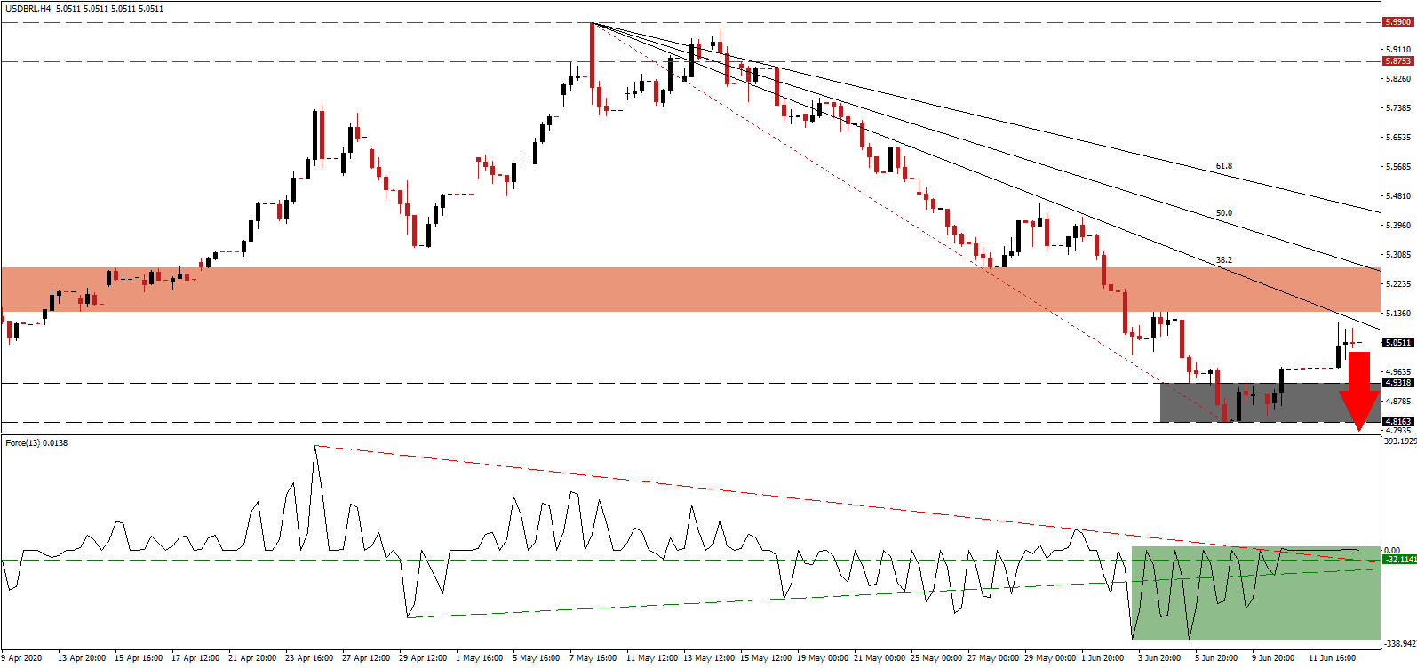 Should the Force Index bounce off of its descending resistance level, serving as temporary support, the USD/BRL may attempt to push higher. The upside potential is limited to its 61.8 Fibonacci Retracement Fan Resistance Level. Forex traders are advised to consider this an excellent short-selling opportunity on the back of magnifying problems out of the US with subsidies for the unemployed set to expire in six weeks.