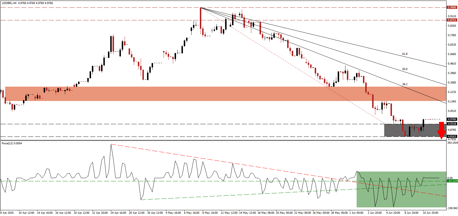 The Force Index, a next-generation technical indicator, maintains the conversion of its horizontal resistance level into support but is unable to add to gains after crossing above the 0 center-line. It risks a swift reversal, and given the proximity of the ascending support level, a double breakdown is favored. Bears will then regain control of the USD/BRL and collapse below its descending resistance level, serving as support, is likely to follow.