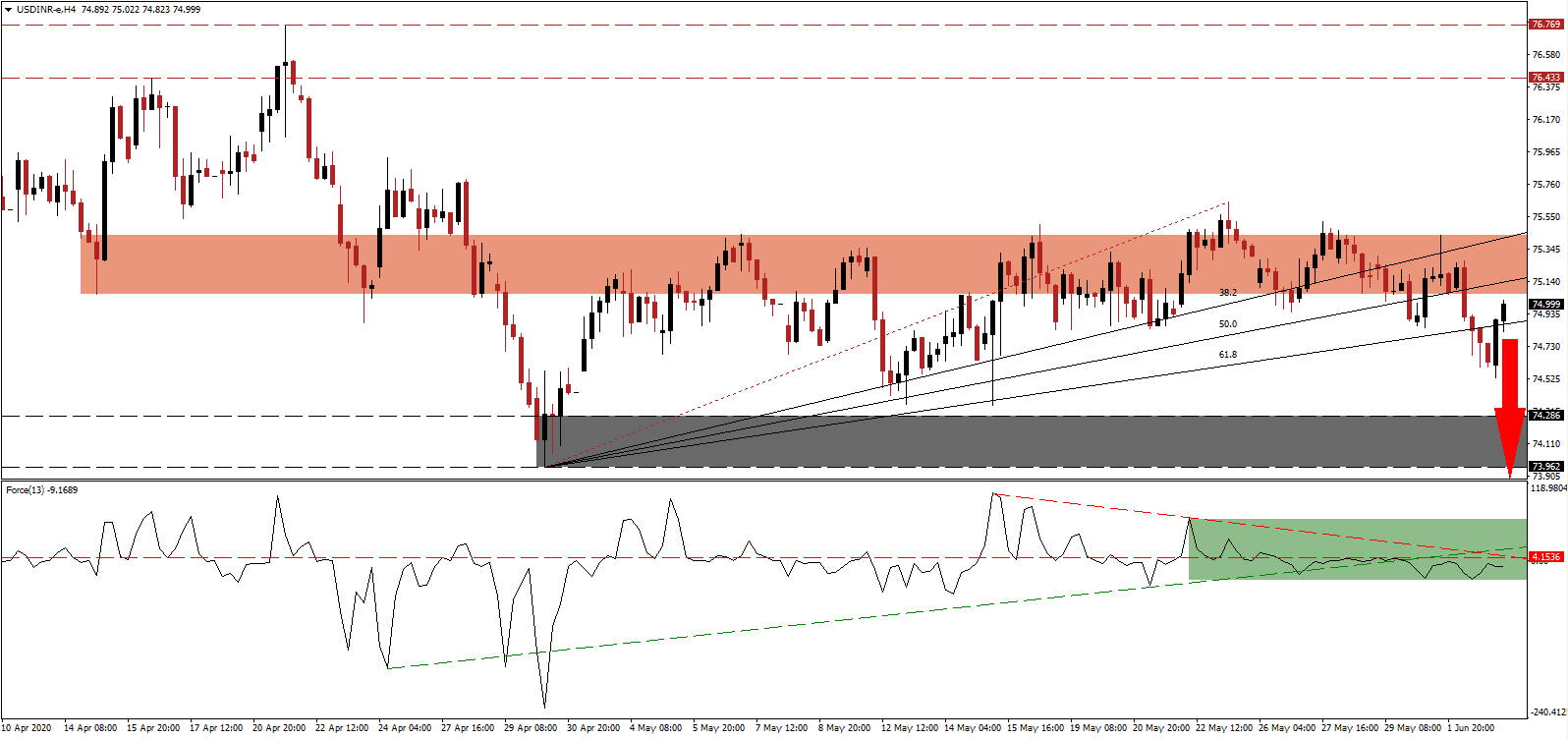 India’s government attempts to strike a balance between stimulating the economy and remaining fiscally responsible. It is apparent in the ₹20 trillion spending package, which consists mostly of expedited pre-approved infrastructure projects and a lack of debt-funded capital injections. It generates a long-term bearish catalyst for the USD/INR, magnified by the uncontrolled and unsustainable debt binge practiced in the US. This currency pair is anticipated to face rejection by its short-term resistance zone located between 75.059 and 75.433, as identified by the red rectangle.