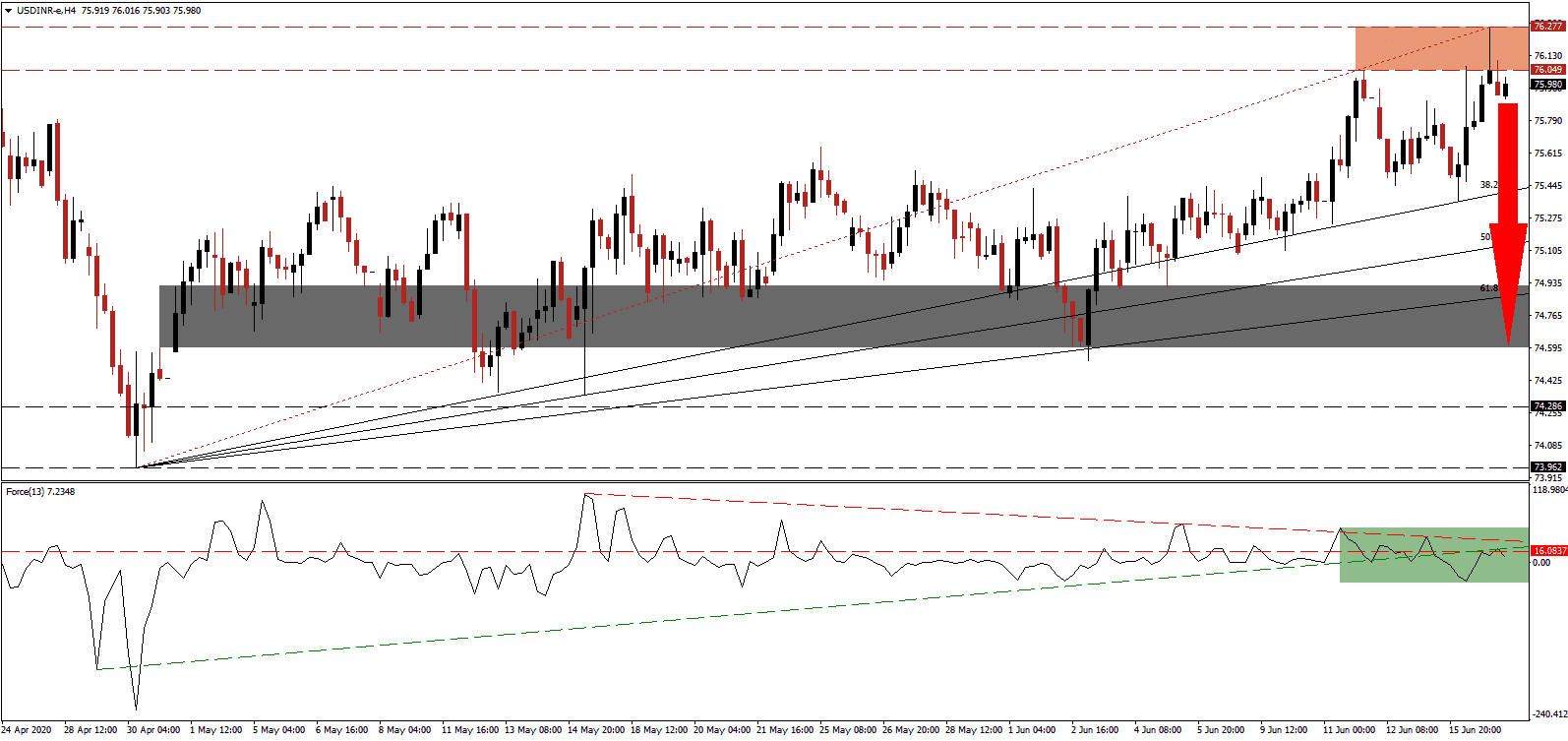 Should the Force Index accelerate above its descending resistance level, the USD/INR may attempt a second breakout. Improving Indian trade data and fiscal responsibility by the government of Prime Minister Modi maintain bearish pressures on price action. They are magnified by more debt and central bank interference out of the US. Therefore, Forex traders are advised to consider any price spike as an excellent selling opportunity. The next resistance zone is located between 76.433 and 76.769.