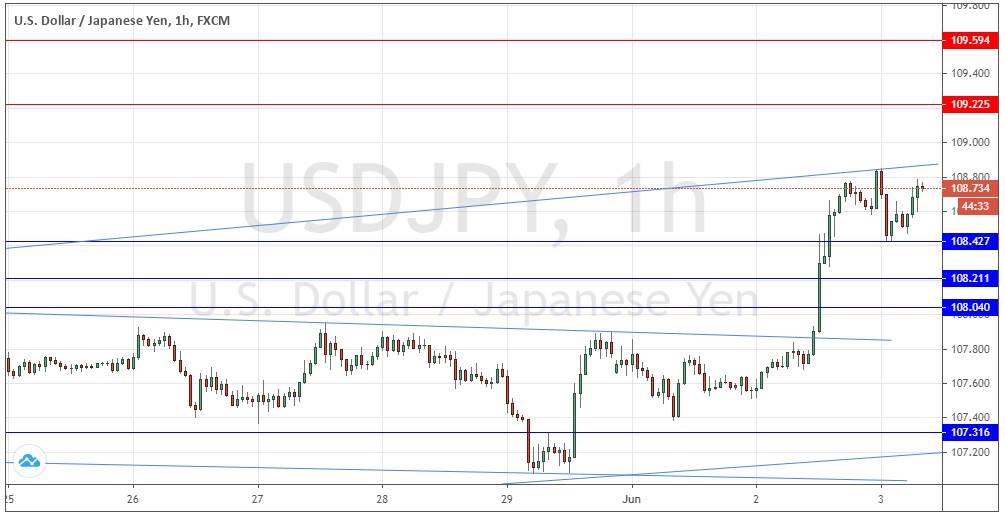 The non-farm payrolls forecast is due close to the New York open, and this pair typically is quite reactive to this data, so what happens in the first hour or two after that release is likely to be significant if it has a bullish effect – if we see the price hold above 108.90 it is likely that the next resistance level at 109.23 will be reached quite fast.