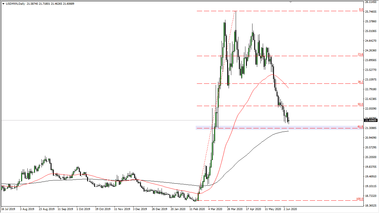Ultimately, I think that the market is probably going to continue to see a lot of technical support in this area, as we have seen quite a bit of buying pressure in this general vicinity back in the early part of March. Having said all of that, the Mexican economy certainly is going to get a bit of a boost due to the coronavirus subsiding a bit, and the United States opening up, which is Mexico’s number one export market. That should continue to lift the Mexican economy a bit, and therefore we should see the move that we have already.