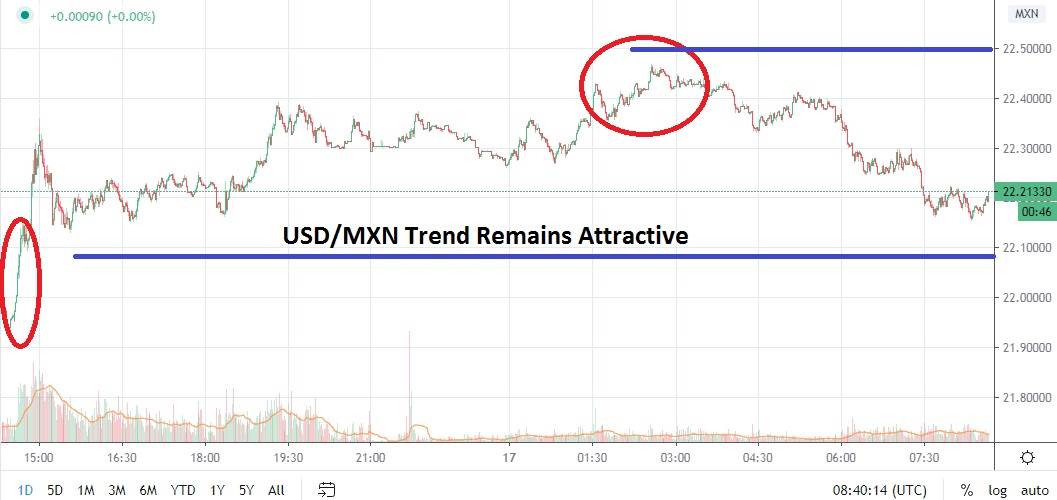 Speculators looking to sell the USD/MXN short term cannot be faulted when looking at current resistance levels and the past two days of trading. The Mexican Peso appears ready to once again find additional value. Traders looking to sell the USD/MXN around values between 22.2000 and 22.4000 and use proper risk management could find themselves in a position to take advantage of a forex market that could be preparing for a weaker US Dollar. The Mexican Peso only last week traded near values of 21.7000 and this juncture is a target many speculators may be envisioning as a solid possibility.