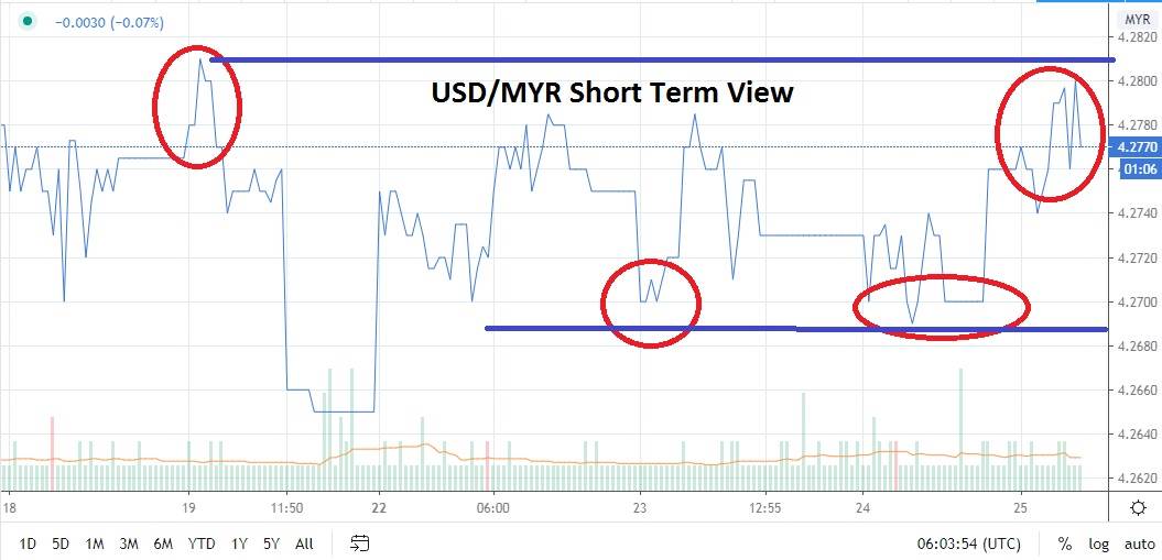 A target for buyers of the USD/MYR short term may be the higher resistance level of 4.2850. However, if a speculator can buy the USD/MYR at levels around the 4.2750 to 4.2770 marks and use carefully chosen stop losses, upside potential and a target near resistance levels of 4.2810 would be a profitable target too.
