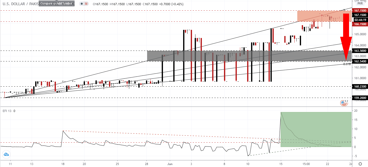 Critics point out that the Pakistani government is more concerned with remaining part of the International Monetary Fund’s Enhanced Fund Facility (EFF) program. Losing access to it will also exclude it from the financial support provided by the World Bank and the Asian Development Bank. Therefore, the US-based IMF dictates terms of Pakistan’s economy, with reports surfacing an insistence to freeze public salaries and pensions. Uncertainty over Pakistan’s economy remains dominant, but a surge in new Covid-19 infections in the US supplies breakdown pressures. The USD/PKR is well-positioned to correct into its short-term support zone located between 162.540 and 163.500, as marked by the grey rectangle, enforced by its ascending 61.8 Fibonacci Retracement Fan Support Level.