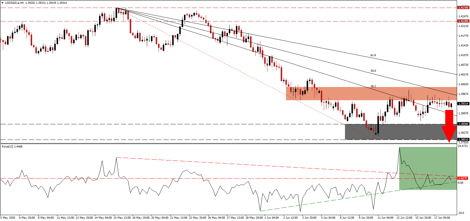 The Force Index, a next-generation technical indicator, briefly pierced above its horizontal resistance level before being pressured into a reversal by its descending resistance level, as marked by the green rectangle. The Force Index is now on track to correct below its ascending support level, adding to downside pressure in the USD/SGD. A pending collapse in this technical indicator below the 0 center-line will grant bears full control of price action.