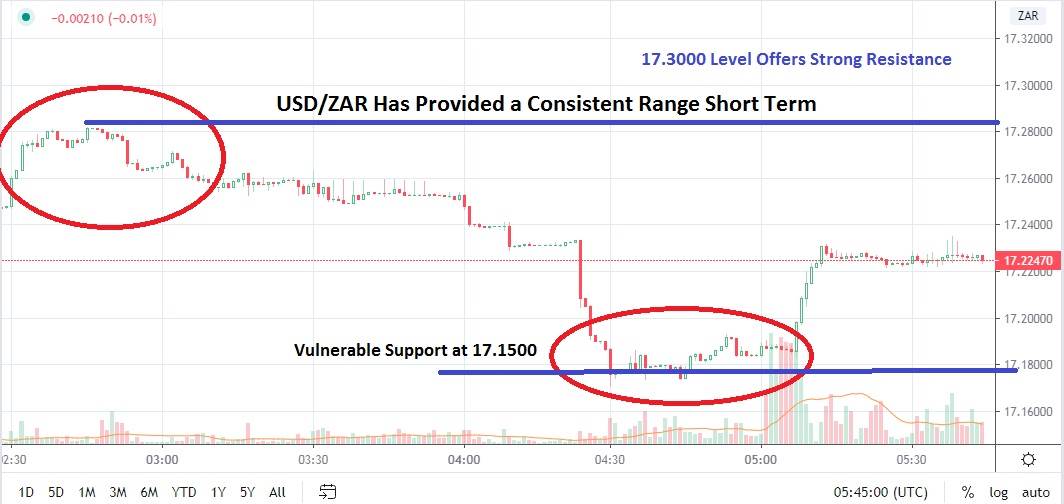 The support level of 17.1000 looks vulnerable and will likely be tested in trading soon meaning a reasonable target for the next move is likely to 17.0000 regarding downward pressure. Traders always need to take ranges and the potential of price swings and keep them in perspective. The band of value being discussed here is not wide. A legitimate price range for the USD/ZAR appears to be 16.8000 to 17.3000. Traders need to keep this value range in their thoughts and place their positions accordingly if they seek short term moves.