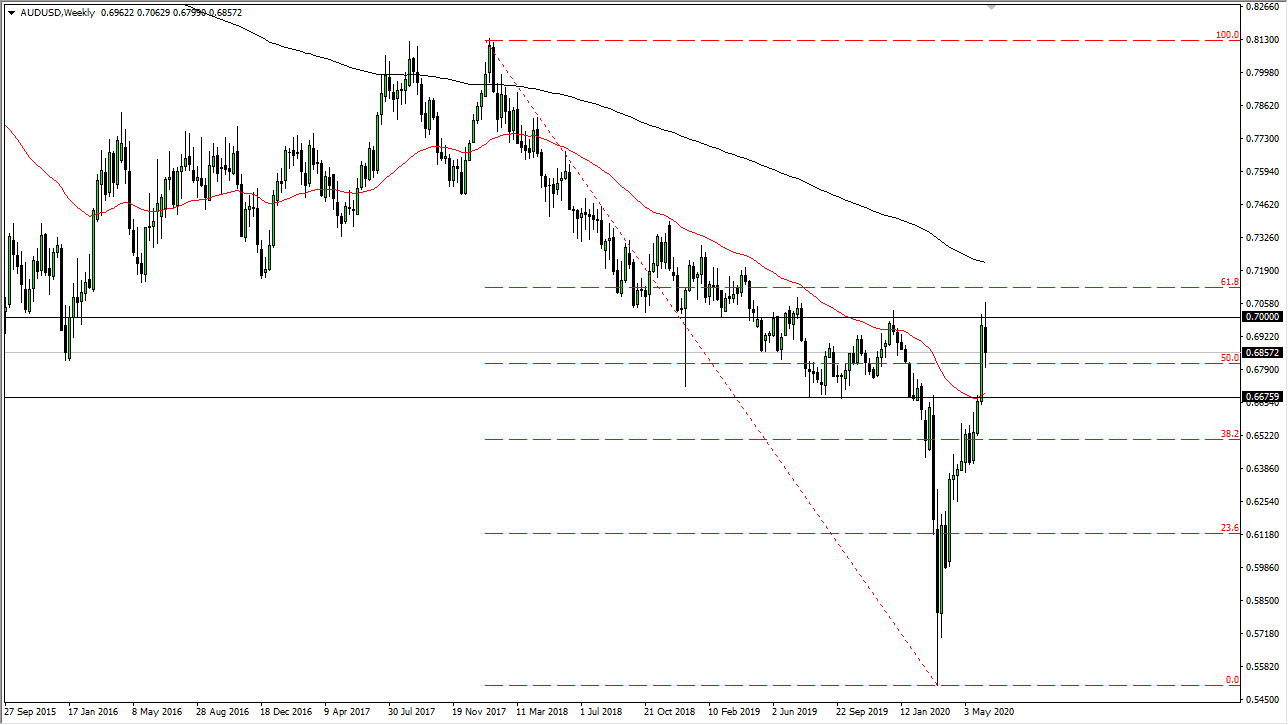 The Australian dollar has rallied initially during the week but found enough resistance above the 0.70 level to cause problems again. Ultimately, I think that the market is likely to pull back, and short-term rallies will probably start to show signs of exhaustion. The 0.6675 level underneath is possibly a target the people will be looking to reach towards. The 50 day EMA is in the same area, as a result I think that is probably a reasonable target. However, if we break above the 0.71 handle, the market is likely to go looking towards the 0.72 handle but being that the Australian dollar has been parabolic for quite some time.