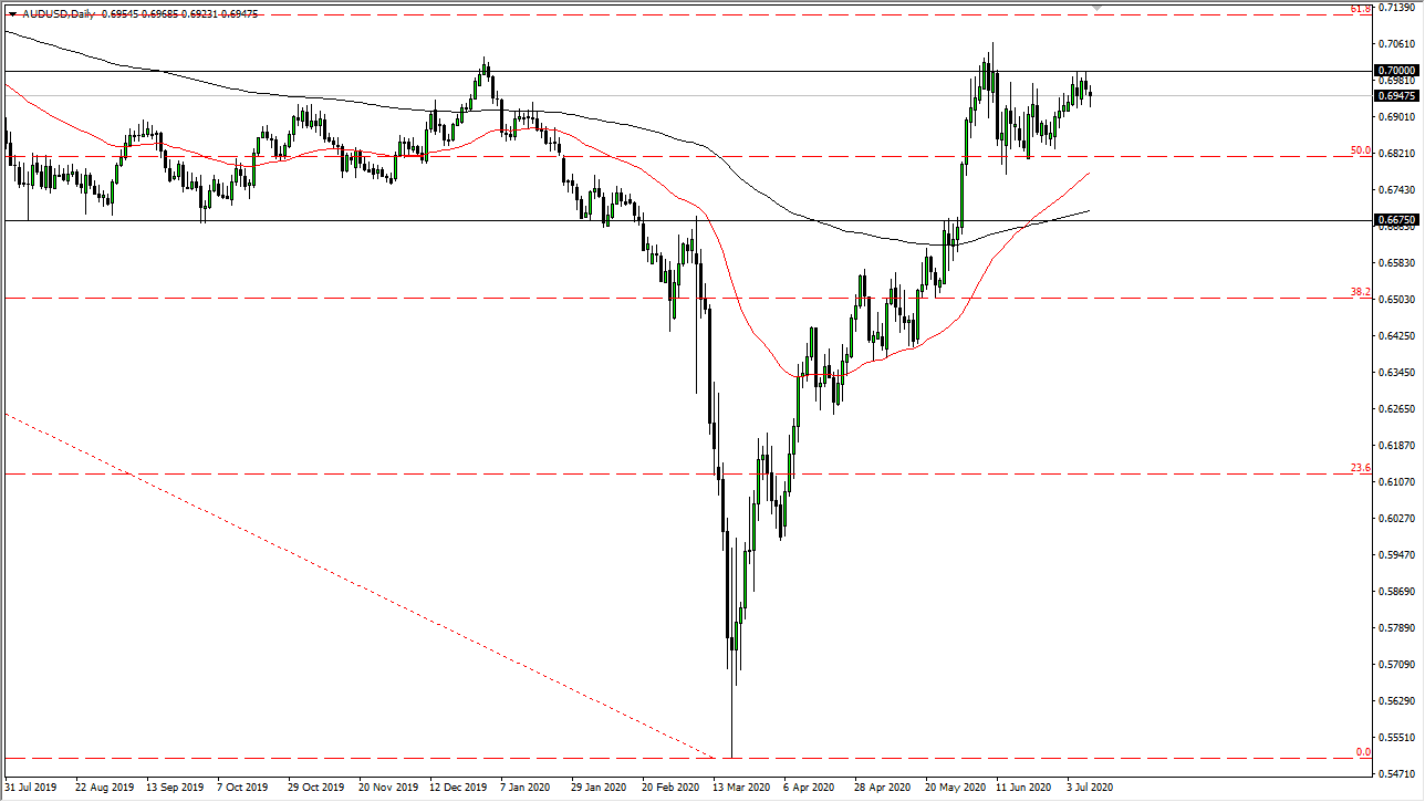 The main thing that is driving this pair higher is probably the Federal Reserve pumping greenbacks into the markets. Ultimately, the Australian dollar is highly levered to the Chinese economy and global growth in general. As we have a lot of concerns about the coronavirus situation and the escalating tension between the United States and China, it would make sense to see the Aussie fall a bit overall. With this, I believe that the market could very well end up falling down towards the 0.68 level underneath, which has been supported. To the upside, we would need to break all the way above the 0.71 level for me to feel comfortable buying because at that point in time it becomes more of a “buy-and-hold” type of scenario.