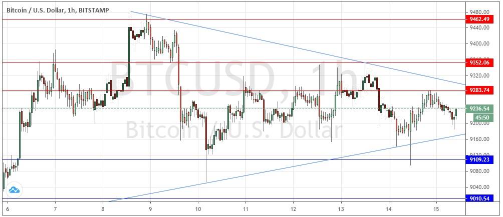 Again, the best that can be said today is that a sustained break below $9,000 will be a bearish sign, while a sustained break above $9,352 will be a bullish sign. I still see value in long trades from firm bounces which might happen at either of the support levels above $9,000.