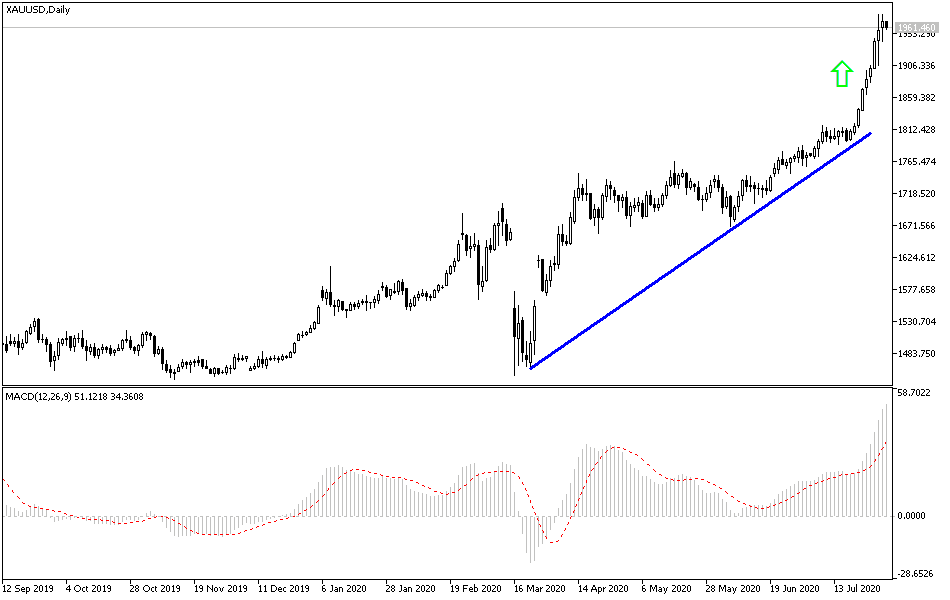 For the third consecutive day, gold ounce price was not able to overcome the $1981 resistance barrier, the highest in the history of the yellow metal, which confirms how overbought gold is after the recent price jumps. Markets await the spark of the green giant comeback to activate the profit-taking sales on the price of gold today, tomorrow, or at any time. Gold price settled around $1956 an ounce at the time of writing. Gold price continues to rise sharply for the ninth session in a row, thanks to the continued demand for safe havens amid the relentless boom in COVID-19 cases worldwide. In addition to that, what supports gains of the metal is the increased tensions between the United States and China to unprecedented levels and the endless stimulus by the global central banks and governments to revive the global economy in the face of the epidemic effects.