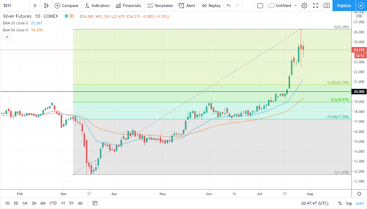 The silver markets have gone back and forth during the trading session on Wednesday as the FOMC has spoken, reiterated and the fact that they are willing to flood the markets with US dollars. Silver has had a massive boost because of this, and at one point over the last couple of days we had gained as much as 7%! That is far too much impulsivity to hang on to in the short term, but I do think that given enough time we will find buyers underneath to take advantage of cheaper prices.