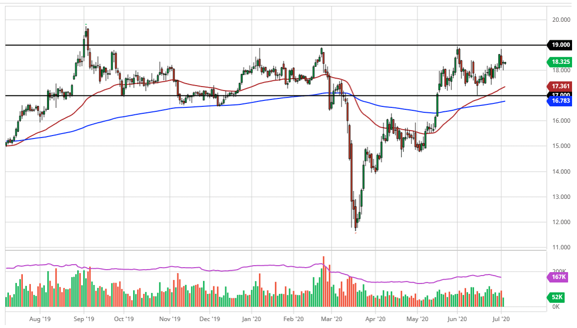 Silver markets have done extraordinarily little during the trading session on Friday which should not be much of a surprise considering that the Independence Day holiday with being observed in the United States. That being the case, the market is likely to simply look at the Thursday candlestick for some type of guidance. If and when it does, then it is going to look at the hammer as a sign that the $18.00 level should continue to offer support. By forming the hammer that it has, it looks like the market is going to try to go looking towards the $19 level again.
