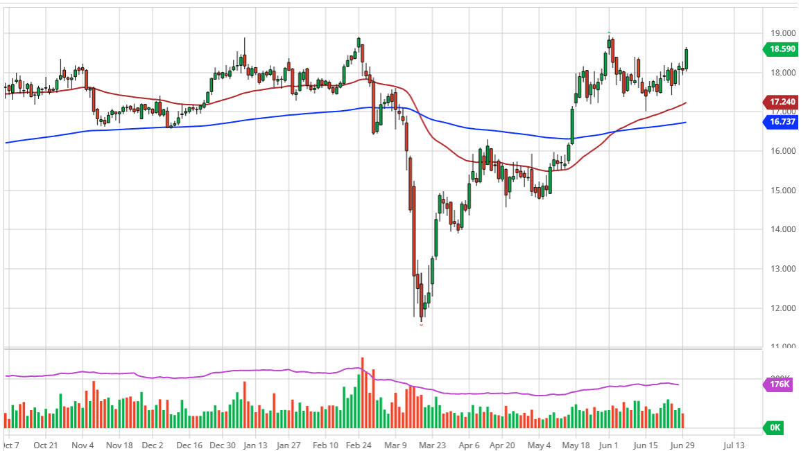 At this point, short-term pullbacks are likely and should be thought of as opportunities in a very bullish market. The $18 level underneath should offer significant support going forward, and therefore I like the idea of buying these pullbacks in order to take advantage of “cheap silver.” Eventually, we will break above the $19 level, which could open up the door to a potential move towards the $20 handle. That is an area that is crucial and will attract a lot of attention. Remember, it was during the Great Financial Crisis that silver broke above the $20 level and then shot straight up in the air towards the $50 level. I do not necessarily think that we are going to do that again, but it certainly is an area that could cause quite a bit of buying pressure.