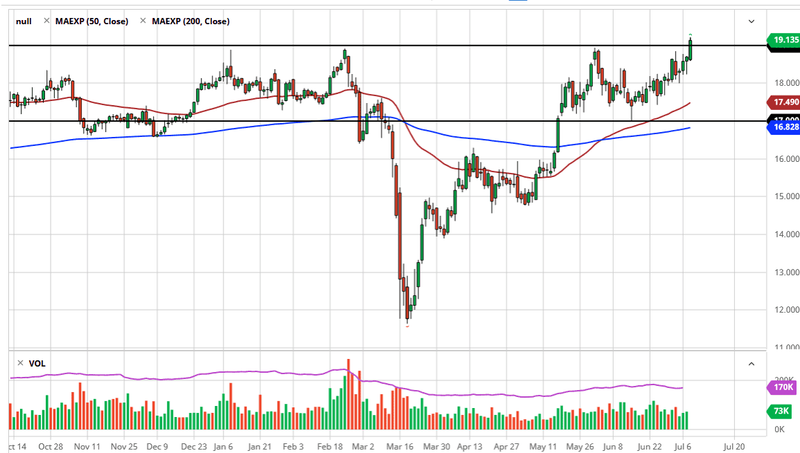 The silver markets have broken above a major resistance barrier during the trading session on Wednesday, leaving the $19 level behind. By doing so, it looks as if the market is ready to go much higher, which is what we have been working towards for quite some time. This was helped by the gold market but at the end of the day it is likely that the markets will continue to react to central bank monetary policy more than anything else. Do not get me wrong, I think that silver still lags due to the fact that it has an industrial component built into it, as there is a significant lack of demand out there when it comes to goods and products.