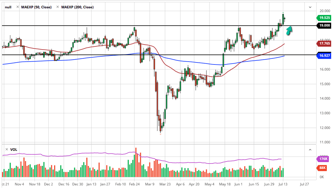 The silver markets did gap a bit lower during the open on Tuesday which was a negative sign and then fell to reach down towards the $19.25 level, for turning around and showing signs of life again. The candlestick for the day is forming a bit of a hammer and that is a bullish sign. At this point, I think it makes sense that the market eventually tries to get through the $20 level, as it is an area that will cause a significant amount of resistance but is also a large, round, psychologically significant number, something that markets tend to be attracted to. I do believe that we will get to the $20 level, but it may take quite a bit of momentum. Pay attention to the US dollar, it can have a major effect on what happens next.
