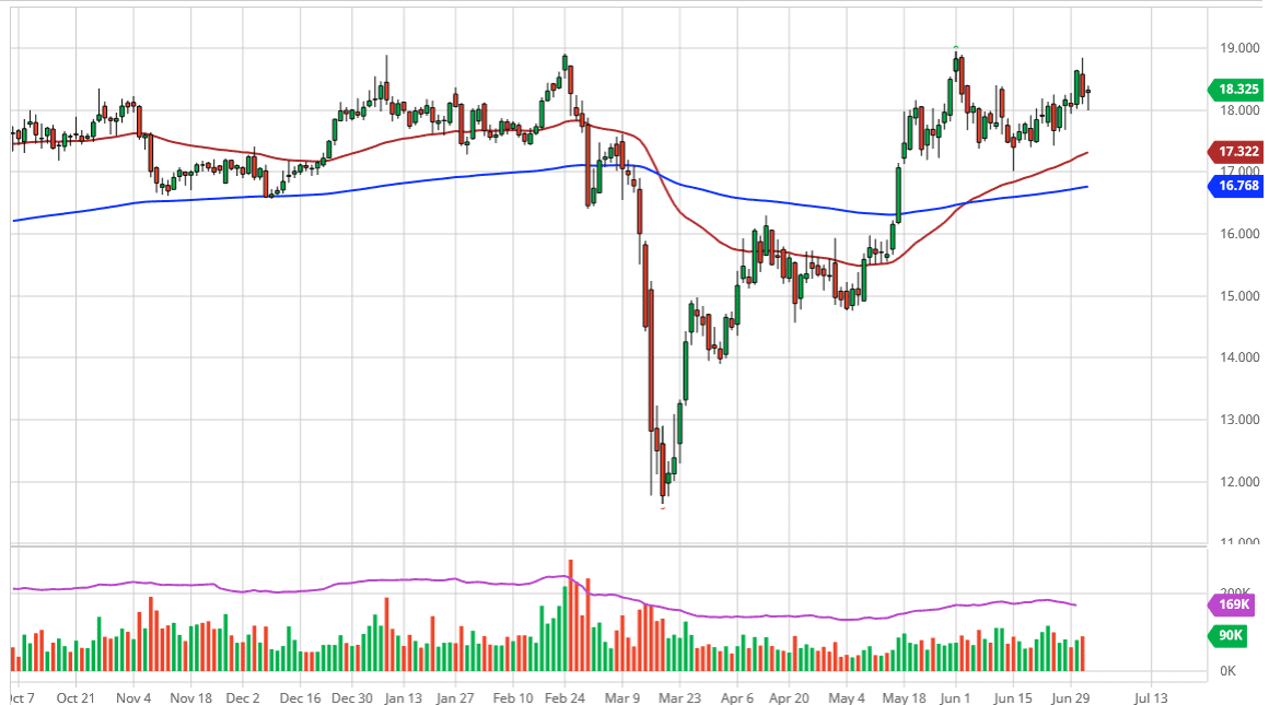 To the upside, I believe that the $19 level is probably the first target for traders to aim for, and once they do it is likely that we will see a bit of selling pressure up there as well. If we can break through there, then the market is likely to go reaching towards the $20 level. That being said, I think it is going to take a significant amount of momentum to make that happen, so I am not overly surprised if it takes quite a while to get there. That in mind, I think that it is only a matter of time before dips are bought into, meaning that this continues to be more of the same type of trading, simply looking for value as it occurs. Once that value occurs, then you have the ability to jump into the market and pick up silver “on the cheap.” With the current environment was central banks, I have no interest in shorting precious metals.
