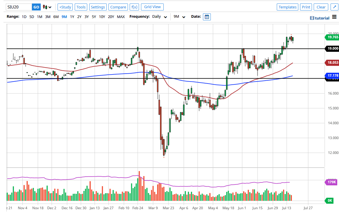 To the downside, the $18 level is where we see the 50 day EMA, which is going to be crucial. All things being equal, I am looking for some type of value to get involved, and although I would be a buyer as soon as we break above the $20 level on a daily close, I prefer buying these dips in short increments in order to take advantage of the volatility of the market, and I do not have any interest whatsoever in trying to short silver because it has been so bullish for so long. Furthermore, the Federal Reserve is likely to continue pressuring the US dollar as the quantitative easing is not going to let out. That being said though, central banks around the world are doing the same thing so I think that if you have the opportunity to buy silver in other currencies, then that might even work out as well. At this point, the US dollar is on its back foot so that should continue to be the main driver.