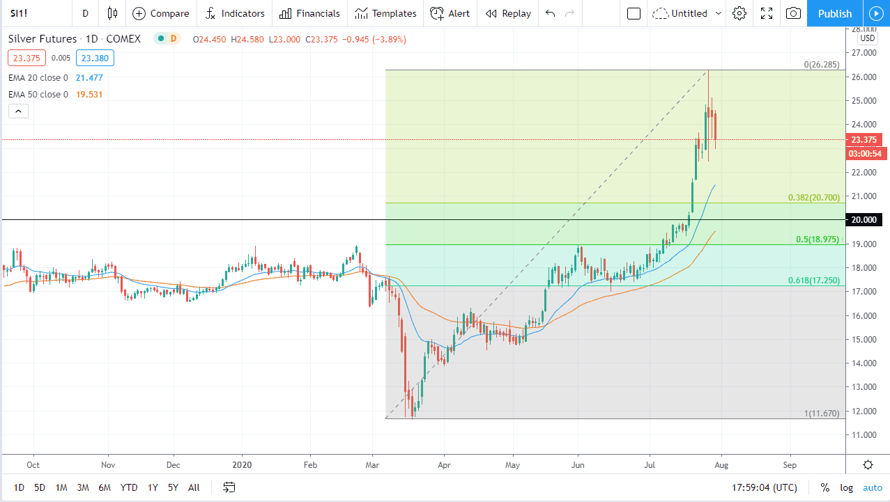 Silver markets pulled back a bit during the trading session on Thursday to test the $23 level. If we can break down below the $23 level, then it is likely we go looking towards the 20 day EMA closer to the $22 level, perhaps even down to the $21 level. At this point in time, the market should continue to see a lot of support underneath regardless, as the US dollar continues to fall, so that of course drives up the value of precious metals in general. Silver is especially volatile, as it is a much smaller market then the gold market, so it will move much quicker. Nonetheless, this is a market that has gotten far ahead of itself, and somewhere near the $21 level we should see the 38.2% Fibonacci retracement level come into play.