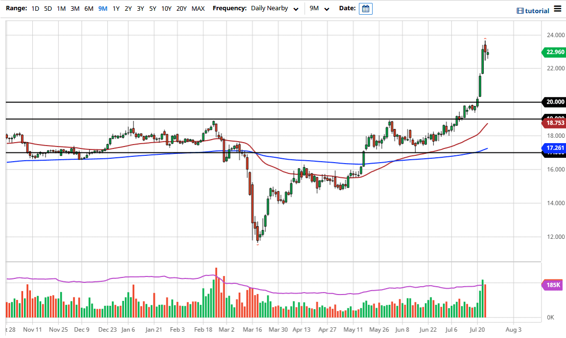 This is all about the US dollar losing value the way it has, as the Federal Reserve continues to liquefy and flood the markets with cheap dollars. As long as that is going to be the case, silver will continue to rally and the breaking of the $20 level has been a significant turn of events. After all, gold already had broken out slightly, and then finally silver joined the party. Silver does tend to work in the same way as gold longer-term, although there is a bit of an industrial demand question when it comes to silver.