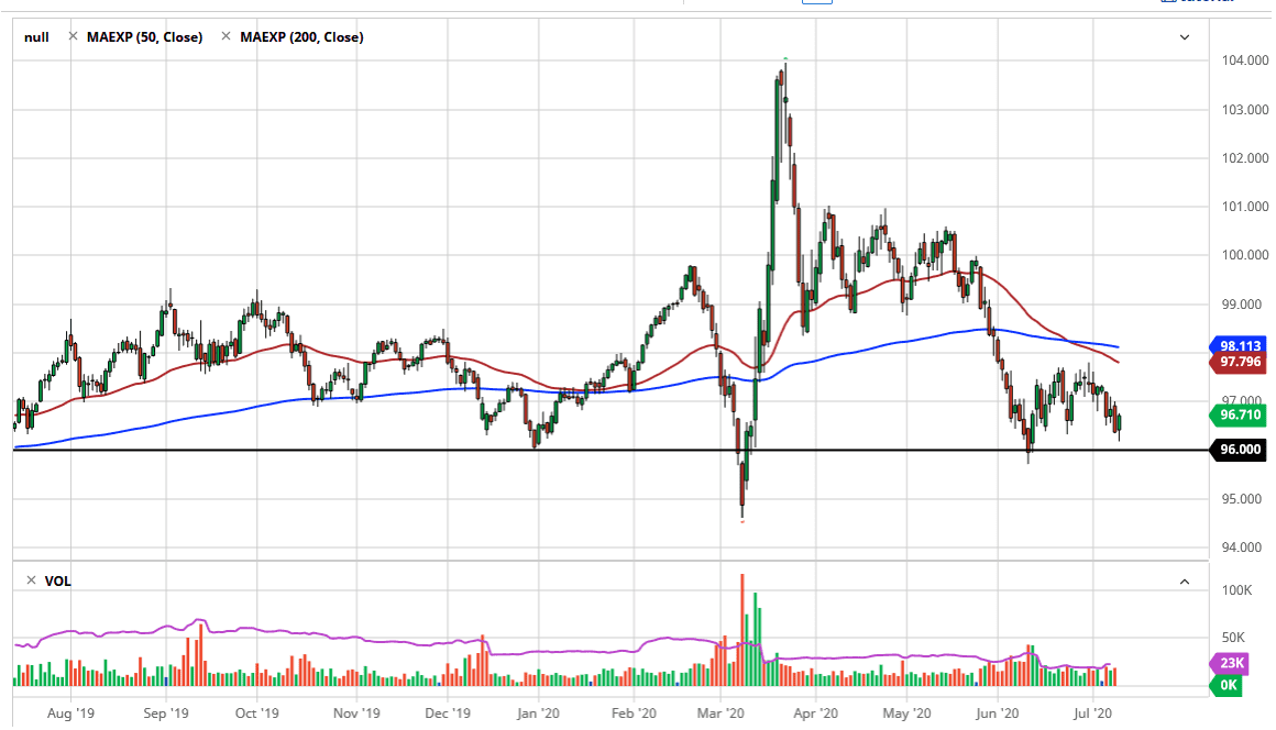 On the other hand, if we break down below the 96 level, then it opens up a move down to the 95 level. This is a market that retail traders need to pay attention to, because the US Dollar Index futures market or the “Dixie”, is an amalgamation of the US dollar against the Euro, Pound, Canadian dollar, Swedish Corona, Japanese yen, Swiss franc, etc. In other words, if you know where the US dollar is going to go overall, that can influence your trades and other currency markets. It is not weighted equally, it is much like the S&P 500, where there are some that are more important than others, the most obvious one be in the Euro as it is almost half of this index. I urge you to pay attention to this chart before placing trades that involve the USD. It makes truly little sense to trade against this currency chart. Another thing that is worth paying attention to is that if we do break to the upside in this market, it is very likely that some of the exotic and emerging market currencies are going to get absolutely hammered, perhaps the Mexican peso, South African Rand, Brazilian real, and many others.