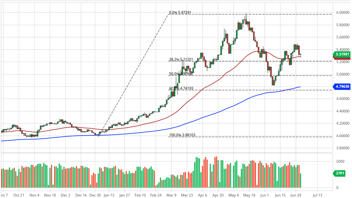 Looking at the chart, it appears that the 5.50 Real level that I was talking about the other day did in fact offer significant resistance but after a quick pullback we have shown signs of life again on Thursday. With the jobs situation getting better in the United States and of course the mortality rate of coronavirus being better than it is in South America, it makes quite a bit of sense that this pair should continue to go higher. Beyond all of that, the Brazilian economy has taken a massive hit, and will take some time to recover. As the United States was starting from a position of strength when the outbreak happened, it should in theory be able to weather the storm quite a bit better than other places like Brazil. At this point, the market looks likely to go back towards the 5.50 Real level and breaking above their opens up a move towards the 5.60 level, followed very quickly by the 5.80 level. I do believe that ultimately, we are going to get back to the 6.00 Real level again, which was the most recent swing high. We have been in an uptrend for some time, and even though we had a pretty shocking pullback in May, we still have plenty of strength underneath.
