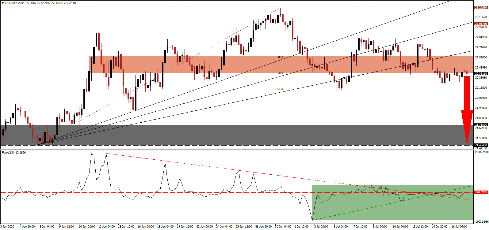 A breakout in the Force Index above its ascending support level, serving as resistance, could pressure the USD/MXN into a temporary reversal. Forex traders are recommended to take advantage of any advance with new net short positions, as the outlook for the US economy and US Dollar are increasingly bearish. The upside potential is confined to its resistance zone located between 23.0171 and 23.2259.