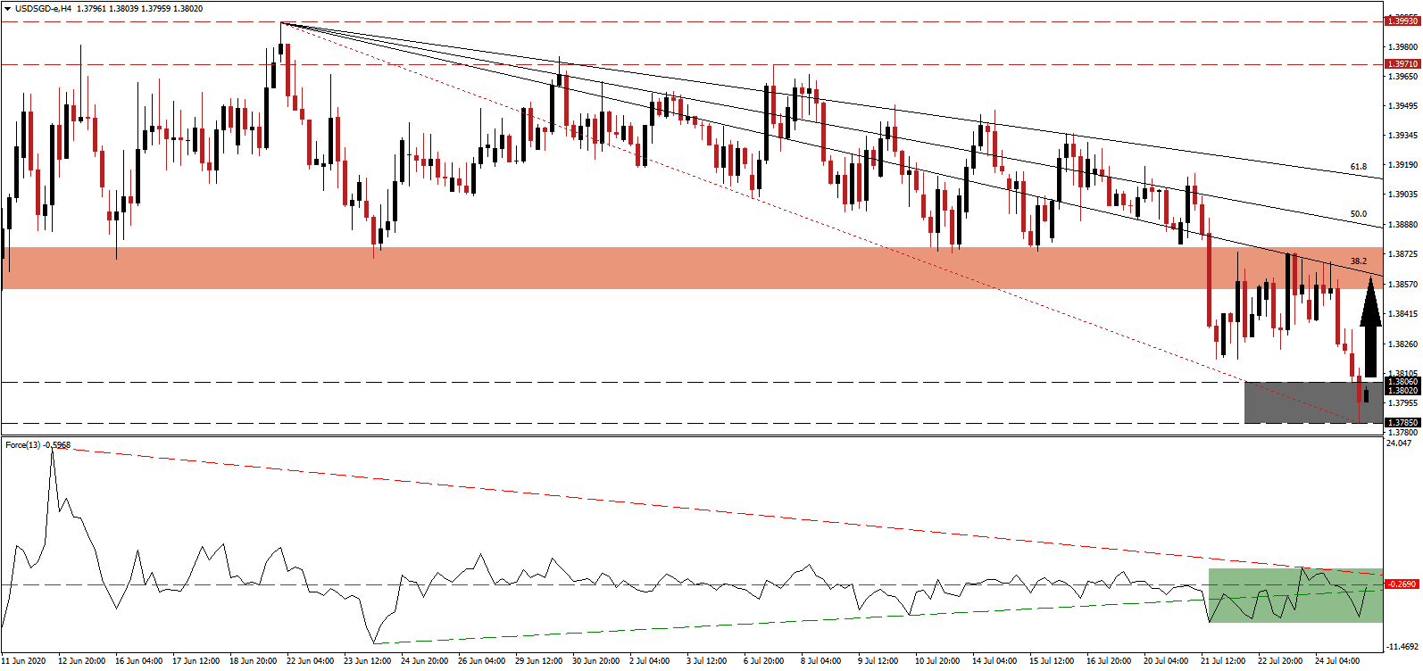 Last week saw an uptick in US initial jobless claims, just as the weekly $600 government subsidy expired. Republicans will announce their fifth proposed stimulus package, with an estimated price tag of $1 trillion in additional debt, and a reduction in the financial aid to the unemployed. The combination limits the upside potential in the USD/SGD to its downward revised short-term resistance zone located between 1.3854 and 1.3876, as identified by the red rectangle. The descending 38.2 Fibonacci Retracement Fan Resistance Level is favored to enforce the long-term downtrend in this currency pair.