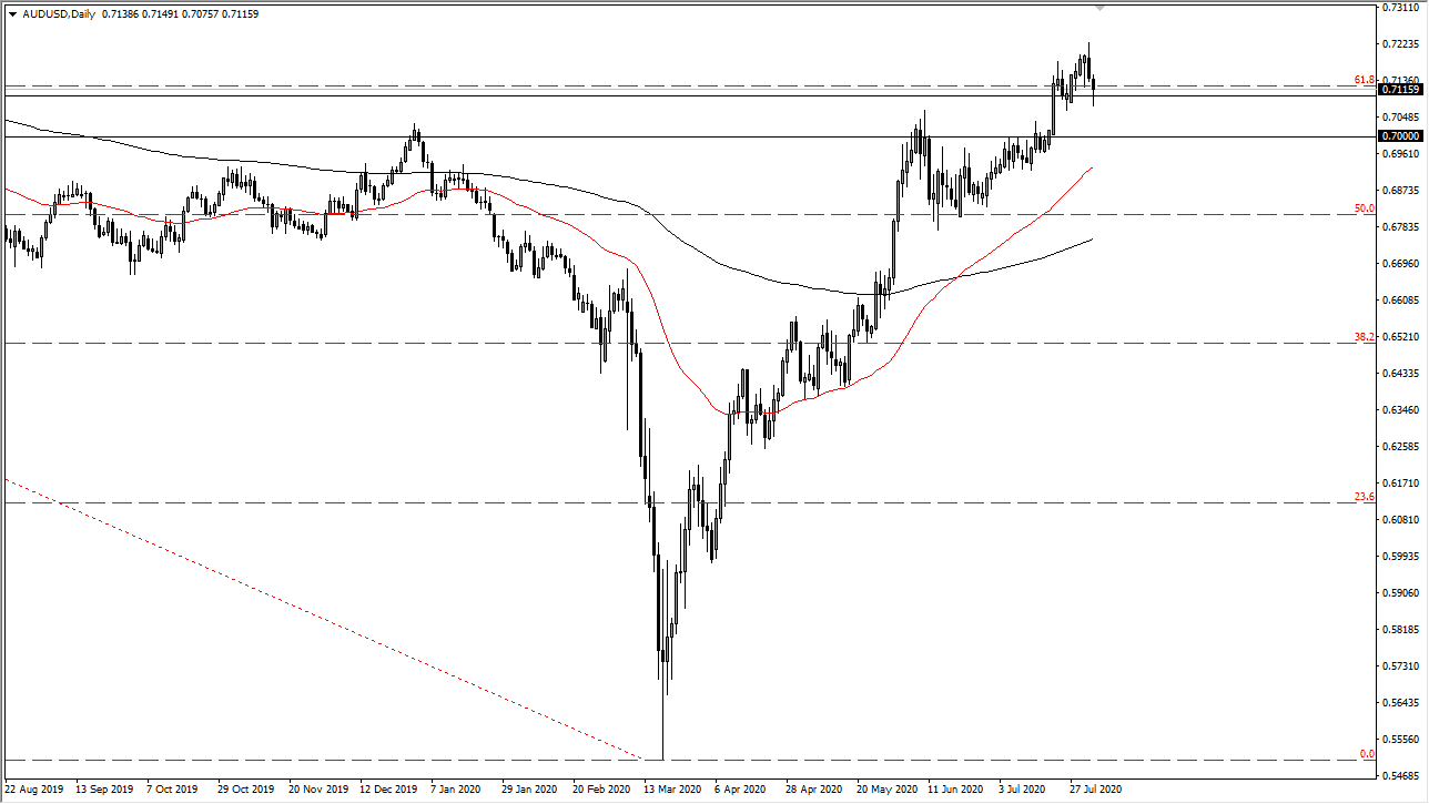 The Australian dollar has pulled back a bit during the trading session on Monday to kick off the week but seems to have plenty of support near the 0.71 level. The 0.71 level begins a significant amount of support underneath that extends down to the 0.70 level. I think that it is only a matter of time before we find buyers that get involved and lift this market. This is an area that I think will continue to be very crucial, so therefore I think that the next couple of days could be rather crucial. The shape of the candlestick is a bit of a hammer, so that is something worth paying attention to as well.