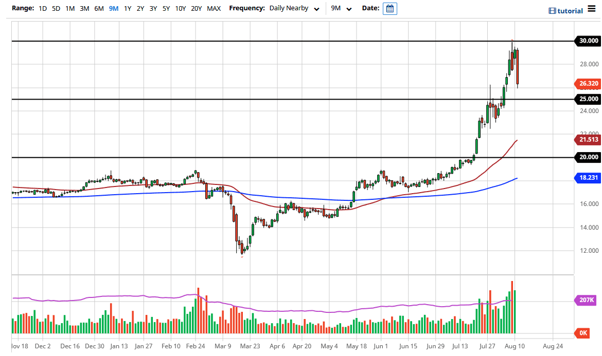 Silver markets have had a horrific day during the trading session on Tuesday, reaching down towards the $26 level. At this point, I think it is only a matter of time before silver find buyers because we are in a bullish uptrend for reason. However, the market had gotten far ahead of itself so it makes quite a bit of sense that we pulled back the way we have, and that being said this is a horrific looking candlestick that should probably have a bit more follow-through.