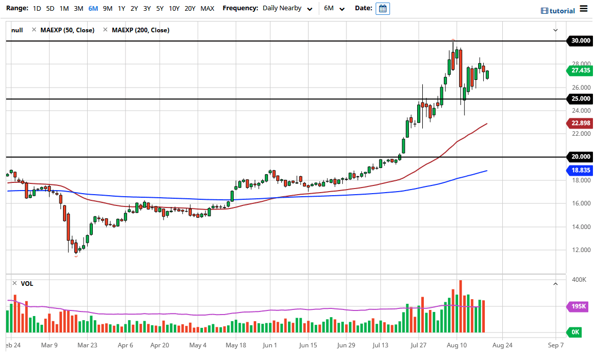 The $25 level is obviously a large, round, psychologically significant figure, so I think there would be a lot of interest there as well. I do believe that silver has much further to go due to the quantitative easing that we are seen not only out of the Federal Reserve, but other central banks around the world. As long as that is the case, it certainly makes sense that we will see traders out there trying to preserve wealth by getting away from fiat currency. The $30 level above should be a target eventually, but the $28 level between here and there will offer a certain amount of resistance as well. Either way, I think that you continue to see value enter the market on pullbacks, as the market has been so bullish as of recent times. I have no interest in shorting, at least not in this present environment.