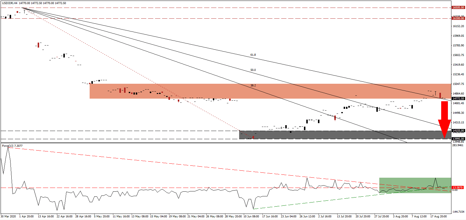 In case the Force Index reclaims its ascending support level, serving as resistance, the USD/IDR may attempt a breakout. After the US Federal Reserve warned on the ongoing economic fallout from the Covid-19 pandemic, the bearish outlook intensified. Forex traders should consider any advance as a selling opportunity, with the upside potential reduced to its intra-day high of 15,125.