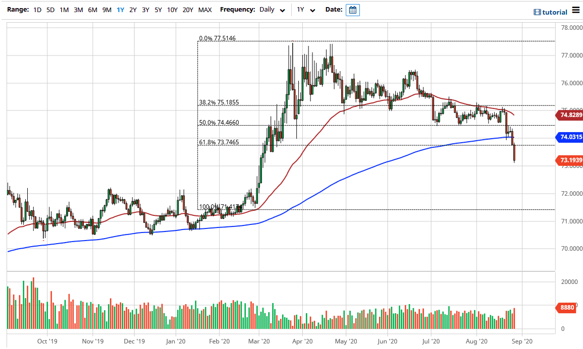 Rallies at this point should run into trouble near the ₹74 level, which was the latest clustering of trade. Until we would break above the ₹75 level, you would have to assume that the downtrend will continue, as the bottom has started to fall out. Looking at this chart, it is very likely that if we wipe out the ₹73 level, we will drop another big handle rather quickly. Ultimately, this will be exacerbated by any type of recovery in India, which of course is coming down the road.