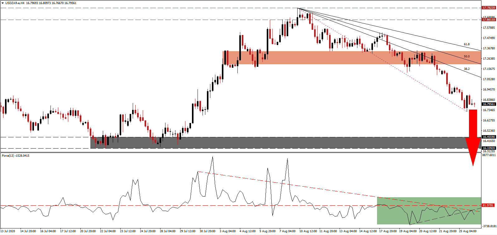 Adding pressures on the government, and potentially widening rifts within the ruling ANZ party, is a controversial interview by former finance minister Trevor Manuel. He stated that South Africa lost three decades of history under the ANZ rule. He later confirmed he referenced ten lost years under former President Zuma rather than three decades. Either scenario confirms the lack of urgency by the ANZ to act, which the Covid-19 pandemic could rectify. The descending Fibonacci Retracement Fan sequence is well-positioned to push the USD/ZAR into its support zone located between 16.3392 and 16.4559, as identified by the grey rectangle. The next support zone awaits between 15.5235 and 15.7482.