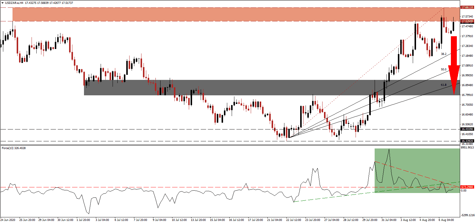 Should the Force Index reclaim its ascending support level, serving as resistance, the USD/ZAR is likely to attempt a breakout extension. The upside potential is confined to its next resistance zone located between 17.8759 and 18.0115 due to the worsening economic outlook for the US. Job cuts in July surged over 575%, while the expiration of the weekly $600 government subsidy to the unemployed resulted in a drop in initial jobless claims. Forex traders should consider any advance price action as a selling opportunity.
