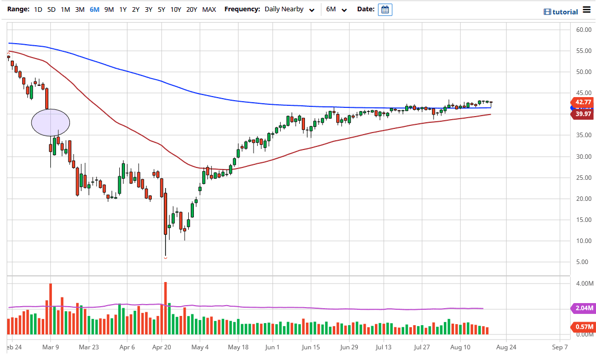 To the downside, it is not until we break down below the 50 day EMA that I would be worried about the grind higher, which happens to sit at the $40 level as well. That is a large, round, psychologically significant figure and it should be noted that the West Texas Intermediate Crude Oil market tends to move in $10 increments anyway. With this, I like buying short-term dips and picking up short-term gains. That has worked out quite nicely over the last several weeks and until we get through vacation season, which could be another couple of weeks, it is very likely we just grind higher in a very slow and methodical manner.