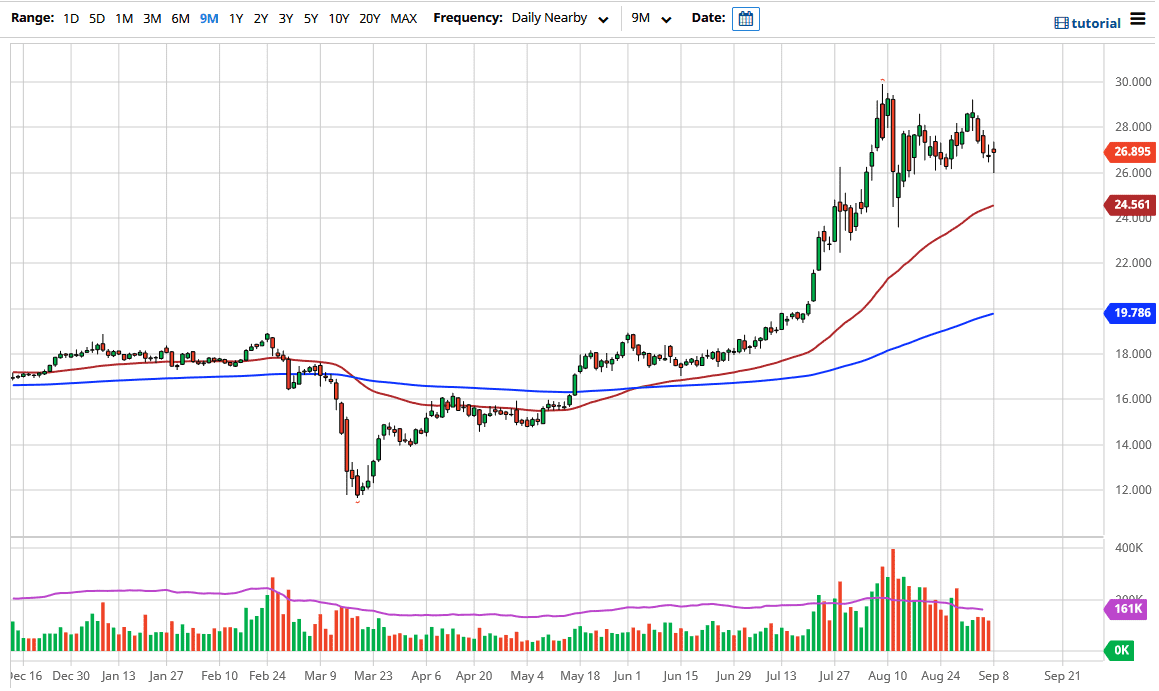 Looking at this chart, it is in an uptrend regardless, and it is worth noting that we recovered quite nicely. Because of this, it does suggest that we will eventually see an attempt to get back in favor and go towards the $28 level. As far as shorting this market is concerned, it is not until we break down below the $24 level that I would be looking to short this market, and at that point, I think that we could drop as low as the $20 level. That is an area that should be rather supportive and structurally important as it was where we broke out above. Ultimately, the market is likely to see a lot of volatility if we do break down, and it will probably be very difficult to hang onto. Keep in mind that the US dollar is a major driver of where this market will go, so that is also worth paying attention to.
