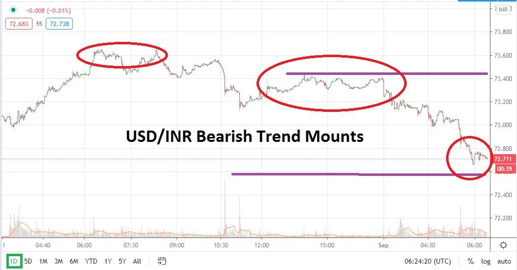 In early trading this morning the USD/INR has demonstrated another leg down and it is testing support levels not experienced since late February. Technically the USD/INR has become part of a parade of emerging market currencies that are enjoying bearish selling. The Indian Rupee is challenging values which may prove to be vital inflection points for traders. The 72.2000 to 72.8000 price range is likely viewed as a key testing ground for the USD/INR. If trading is sustained within these levels near term and a reversal upwards does not ensue quickly, speculators will suspect the USD/INR has the ability to gain more downward momentum.