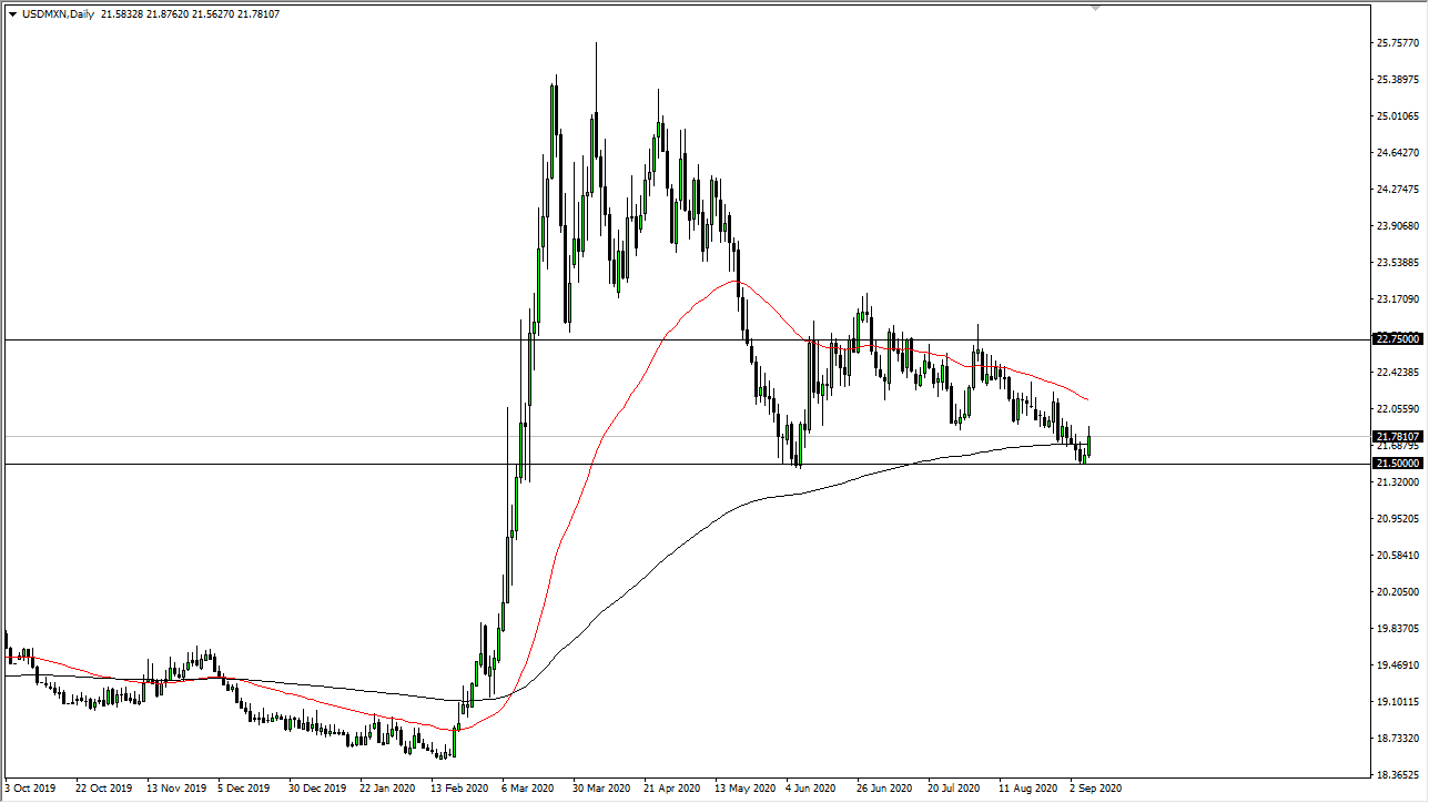 When you look at the structure of the chart, you can make a strong argument for the idea of the 200 day EMA coming in and affecting how the market traded, but you can also start to look at the 21.50 pesos level as a potential support level as well. If we do bounce from here it will technically be a “double bottom.” We have a long way to go before we can call it that, but clearly the last couple of days have favored the US dollar overall, and that is not going to be any different here. Because of this, I am looking to buy short-term pullbacks and perhaps aim for the red 50 day EMA, maybe even as high as 22.75 pesos. Keep in mind that this pair tends to trade during North American hours more than anything else, so if you put a position on, you might be kind of bored watching it during European hours and even more so during Asian hours. Because of this, you need to keep your position size somewhat light, as spreads will widen. This is not necessarily anything that is particularly unique about this pair, as it is that way with all exotic pairs.