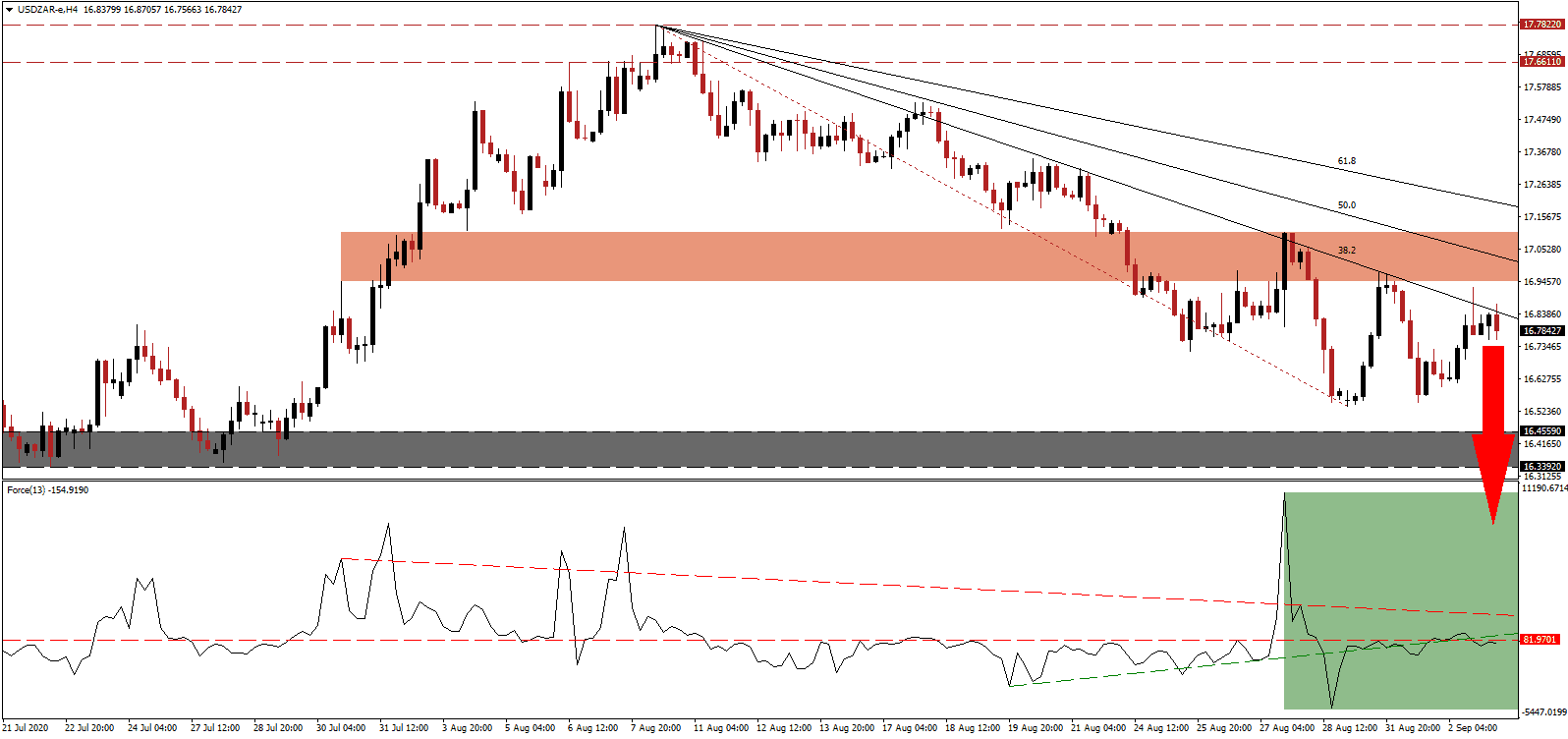 After President Ramaphosa survived a bid to out him over the weekend, enthusiasm over his pledge to fight corruption is fading. The attention remains focused on the pandemic and an unemployment rate above 31%. Economists lowered their initial 2020 GDP forecast from a growth rate of 0.6% to a contraction of 8.1%. The 2021 outlook increased from an expansion of 1.2% to 3.2%. After the second rejection by its short-term resistance zone located between 16.9456 and 17.1058, as marked by the red rectangle, the USD/ZAR is well-positioned to accelerate its breakdown sequence.